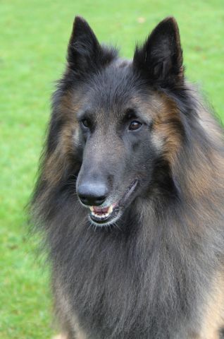 + Rüde von vorzüglicher Größe, vorzügliche Haarstruktur, vorzügliche Maske, sehr freundliches Wesen- sehr kräftiger Rüdenkopf, lose Lefzen, runder Oberkopf, etwas sehr lange Ohren, Haar sollte länger sein und mehr Unterwolle haben, langer Unterschenkel und kurzer Oberarm, dadurch ist der Rüde etwas überbaut